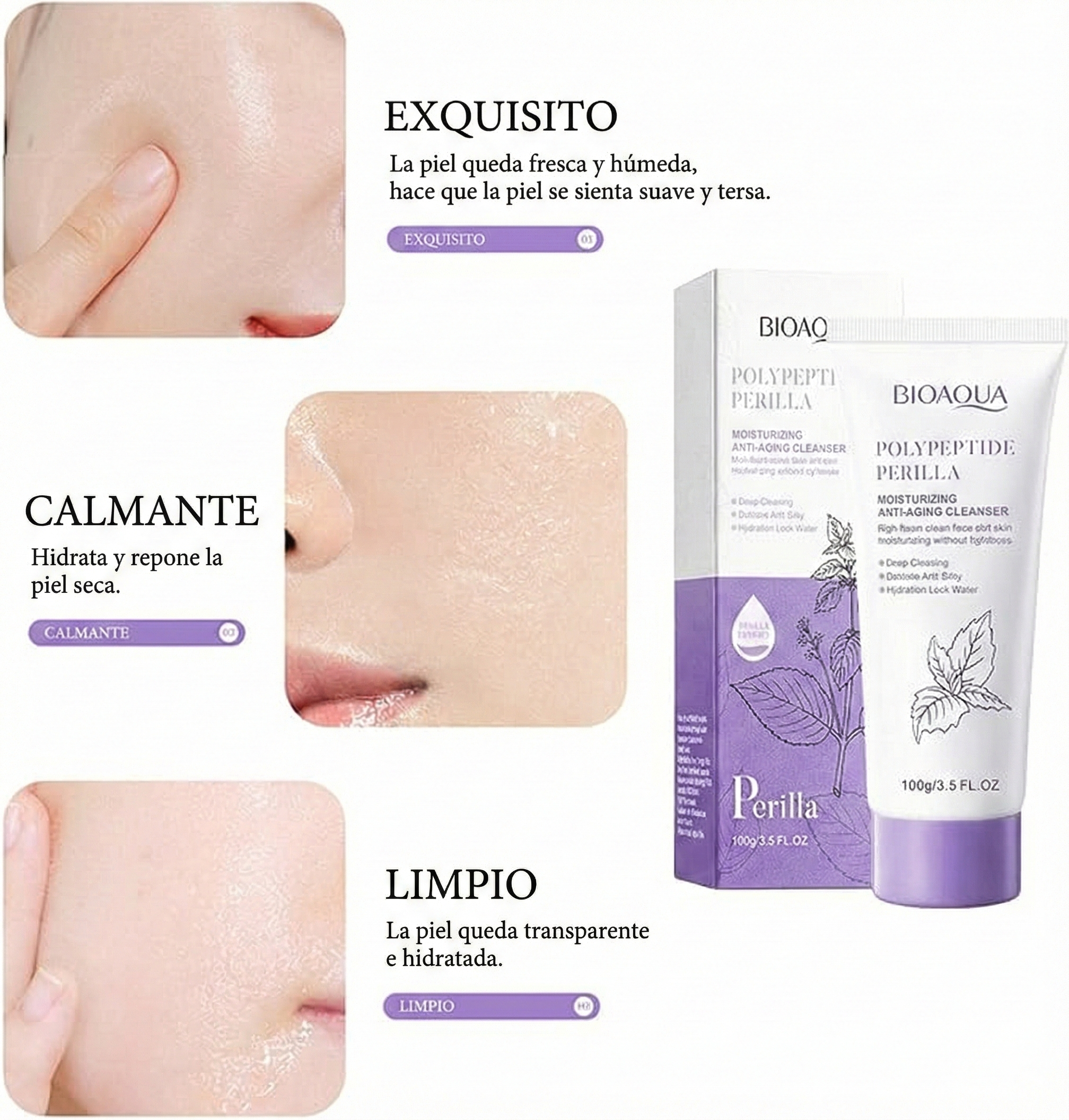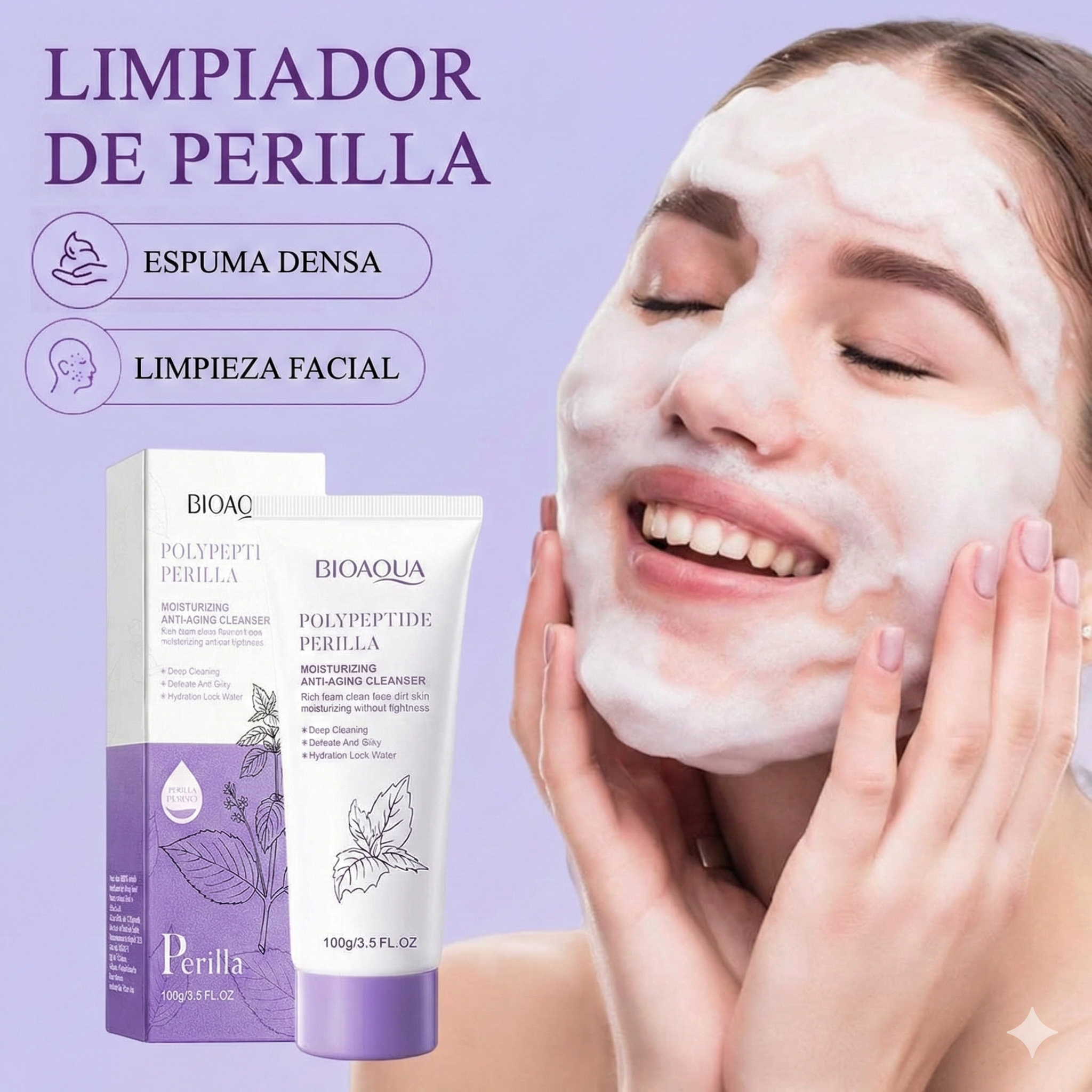 El Limpiador Anti-Edad de Polipéptidos y Perilla Bioaqua es una espuma facial hidratante diseñada para limpiar profundamente la suciedad y el exceso de grasa mientras combate los signos del envejecimiento gracias a su extracto de perilla y polipéptidos. Su fórmula rica y sedosa purifica los poros sin dejar sensación de tirantez, bloqueando la humedad en la piel; para utilizarlo, genera espuma con un poco de agua, masajea suavemente sobre el rostro húmedo y enjuaga, dejando tu piel fresca, suave y rejuvenecida.